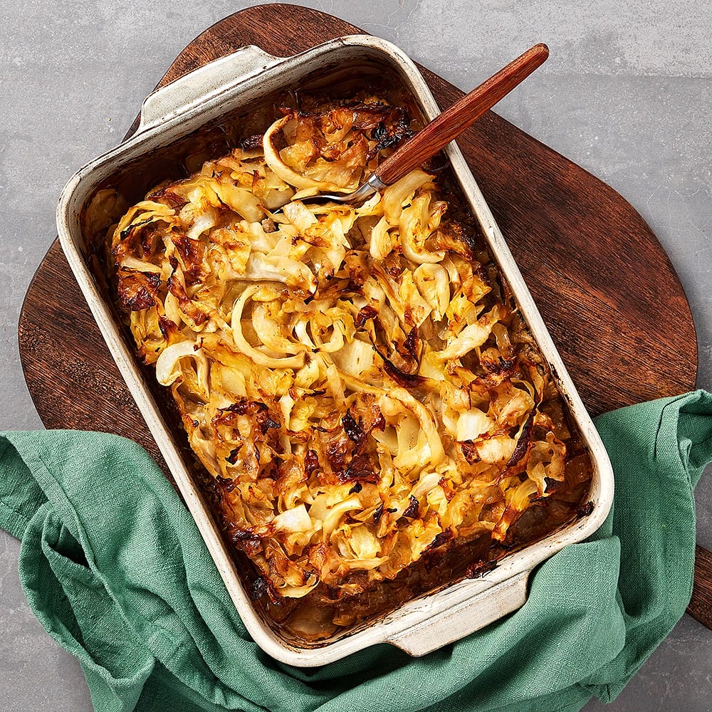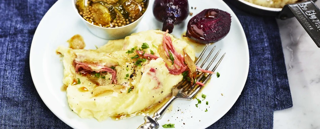 Bakad fläsksida med knaprig svål, palsternackspuré, syltade rödlökshjärtan och hasselnötter
