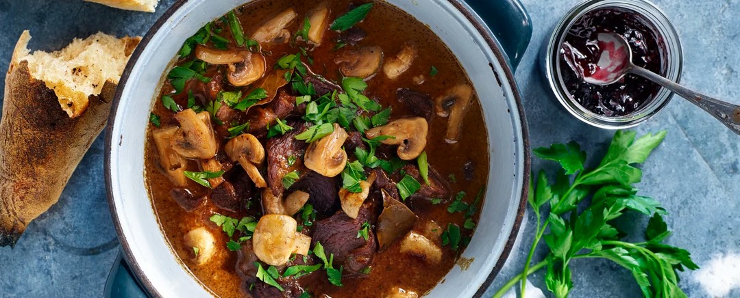 Mustig Köttgryta med Kantareller och Rosépeppar