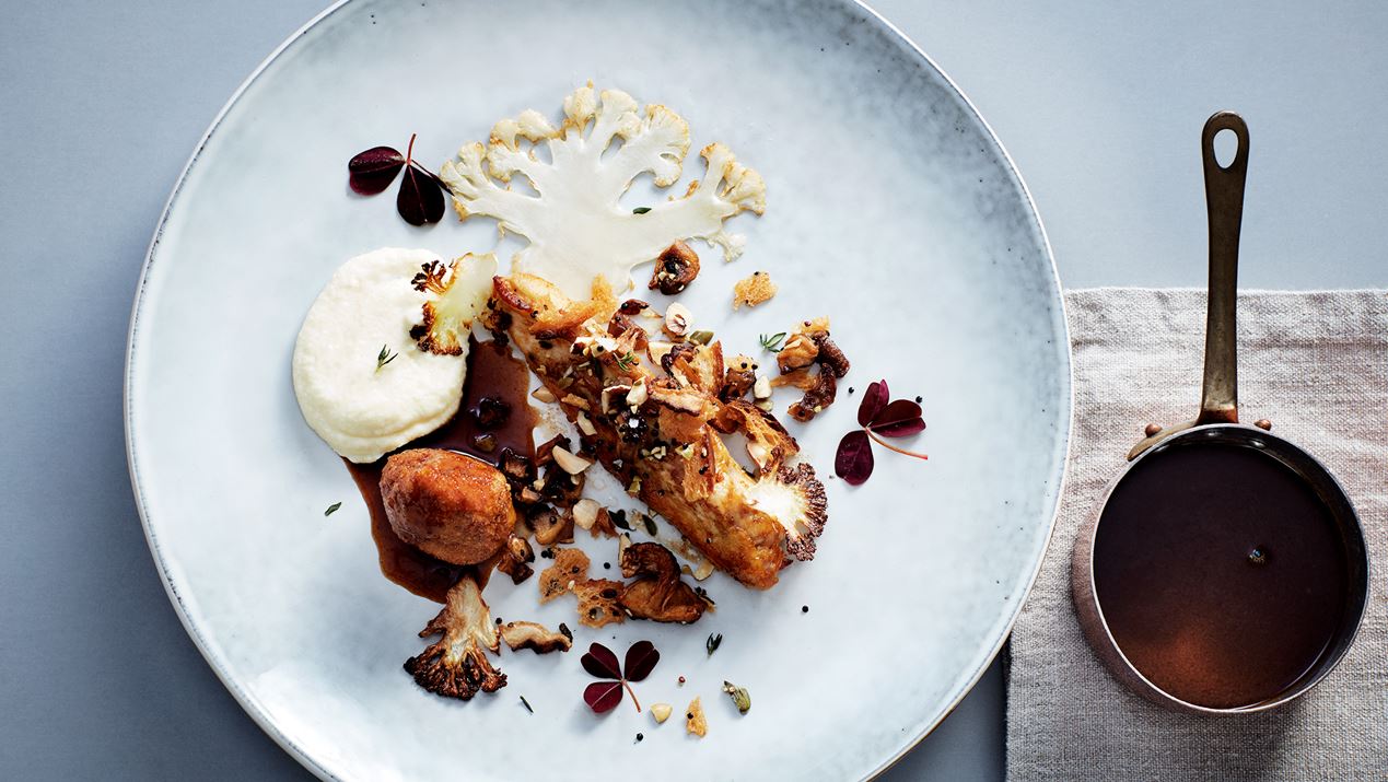 Smörstekt torskrygg med potatispuré, fänkålsflarn, bacon och vitvinssås