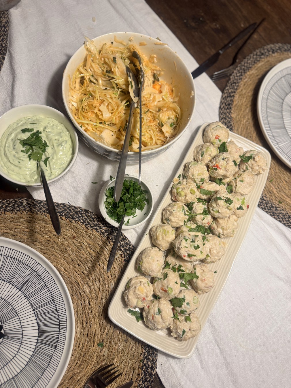 Ångkokta kycklingbollar med koriandermajo och vitkålssallad