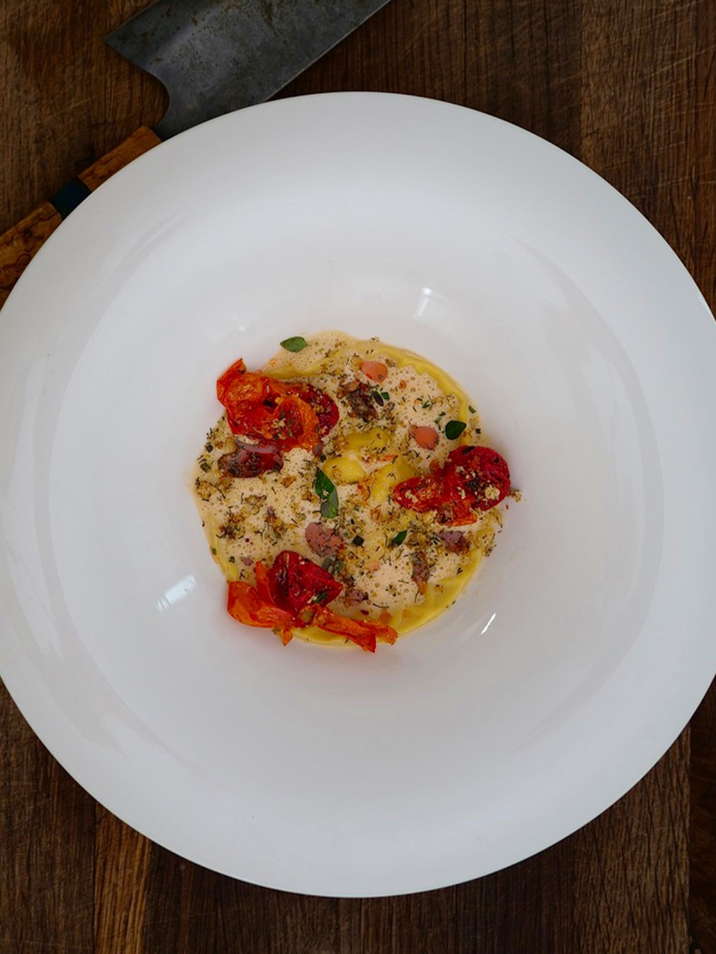 Ravioli fylld med hummer, bakade tomater och smörad hummersås