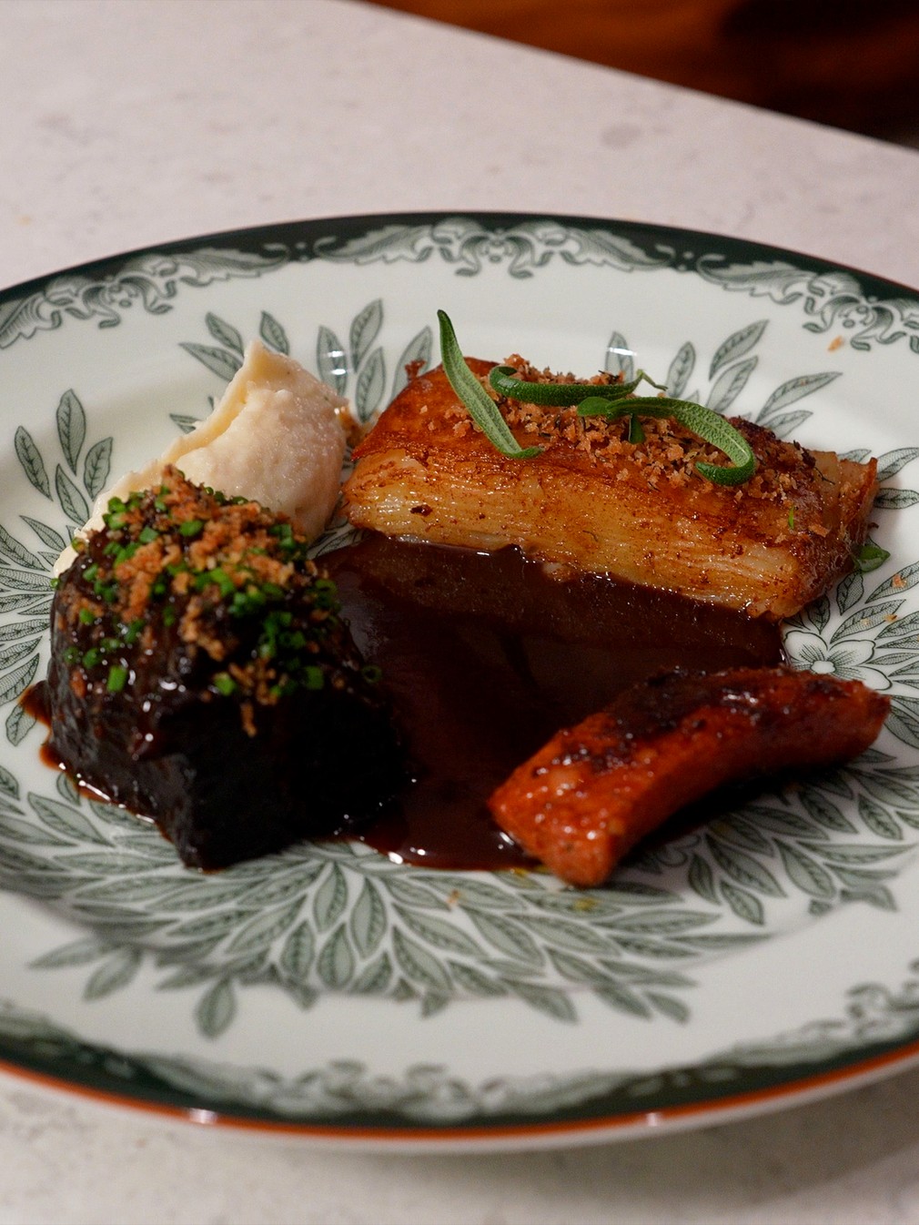 Rödvinsbräserad oxkind med potatiskaka och jordärtskockspuré
