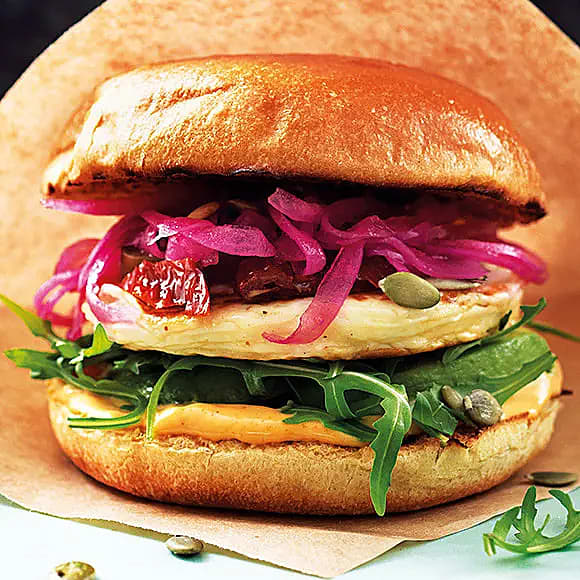 Halloumiburgare med srirachamajonnäs och soltorkade tomater