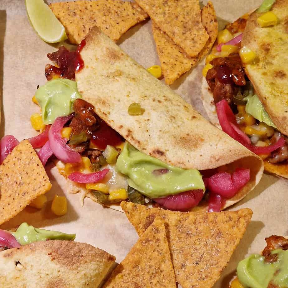 Kycklingtacos – pulled chicken med barbequesås, smörstekt majs och avokadokräm