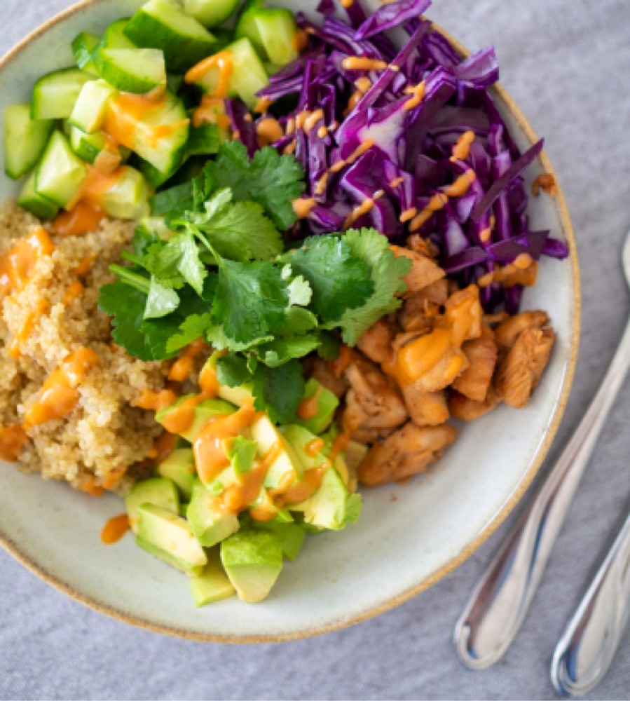 Lägg quinoa, gurka, avokado, rödkål och kyckling i en skål. Toppa med dressing och koriander.