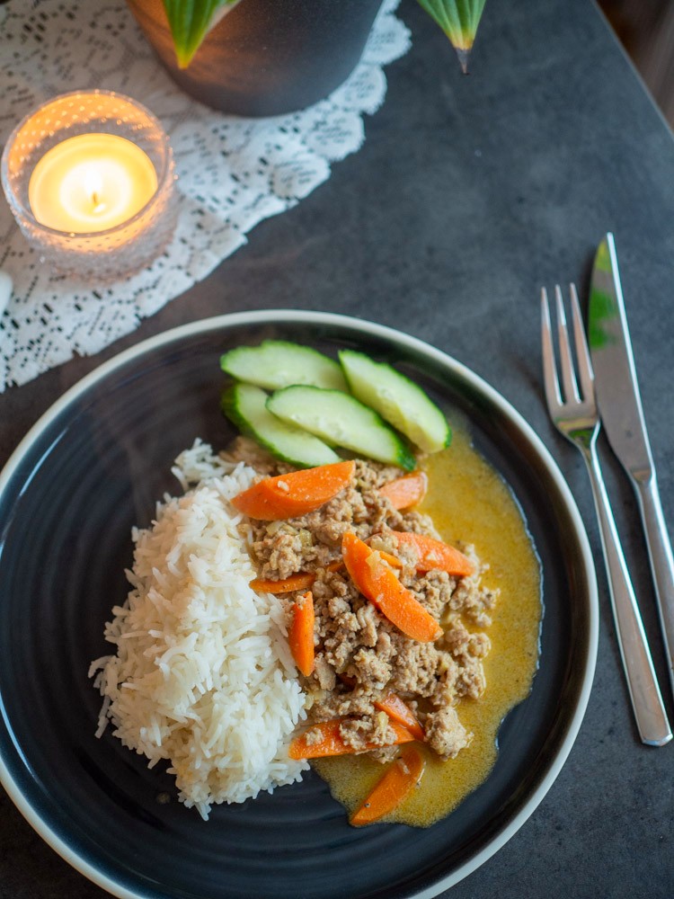 Ha sedan i kycklingfärs och krydda med salt och svartpeppar. När färsen fått fin färg kan du tillsätta morötter och kokosmjölk. Låt puttra 5 minuter och saka sedan av med salt, svartpeppar och pressad lime.